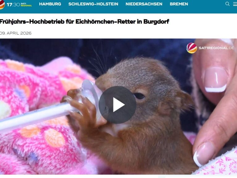 Sat1 Regional über die Eichhörnchen Rettungsstatioon Burgdorf- Der Lebensraum von Eichhörnchen wird immer kleiner, und die Gefahren im Straßenverkehr nehmen zu. Besonders jetzt im Frühjahr, wenn die Nager ihre Winterquartiere verlassen, ist in Burgdorf bei Hannover (Niedersachsen) Hochbetrieb in der Rettungsstation. Dort kümmern sich Ehrenamtliche um verletzte Tiere und geben ihnen eine zweite Chance.